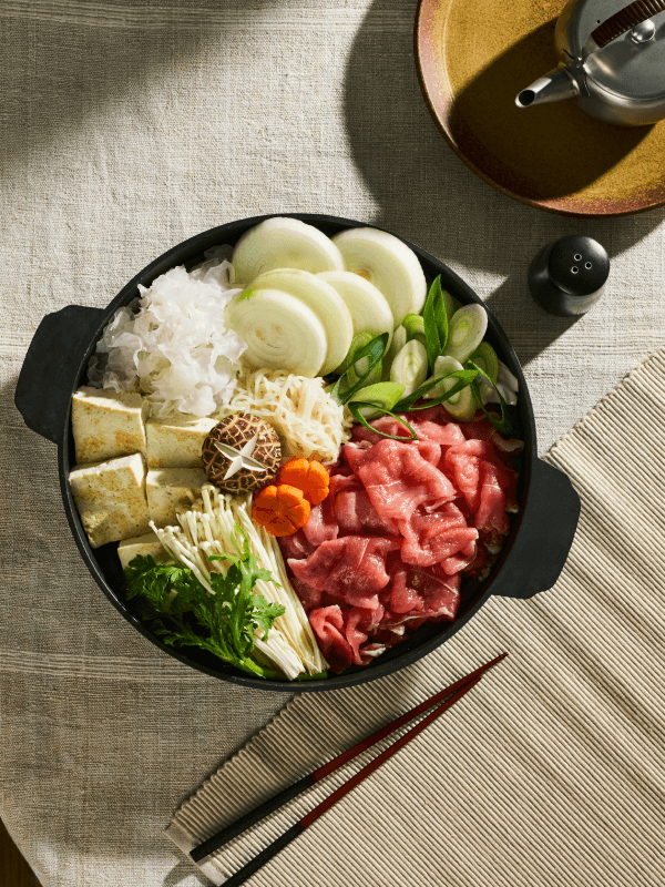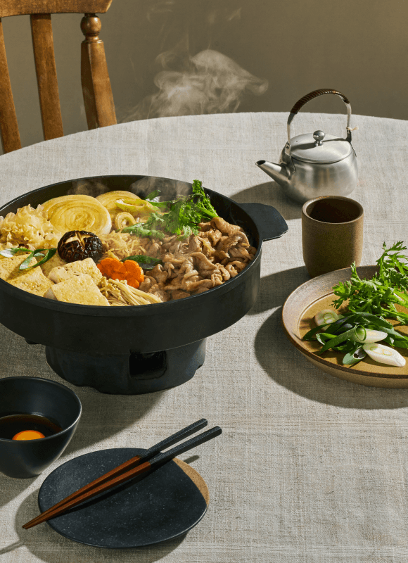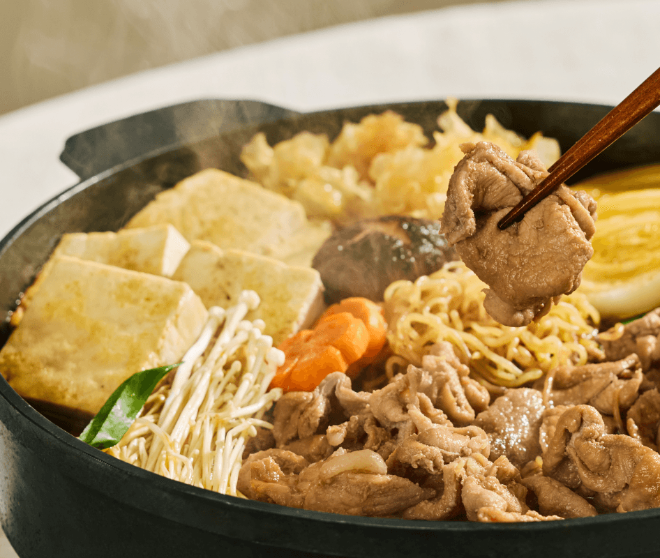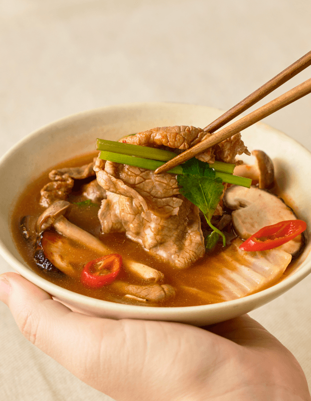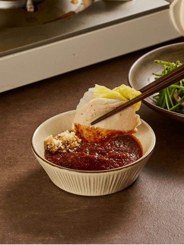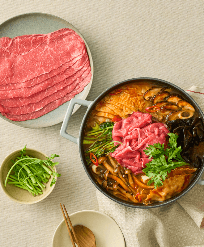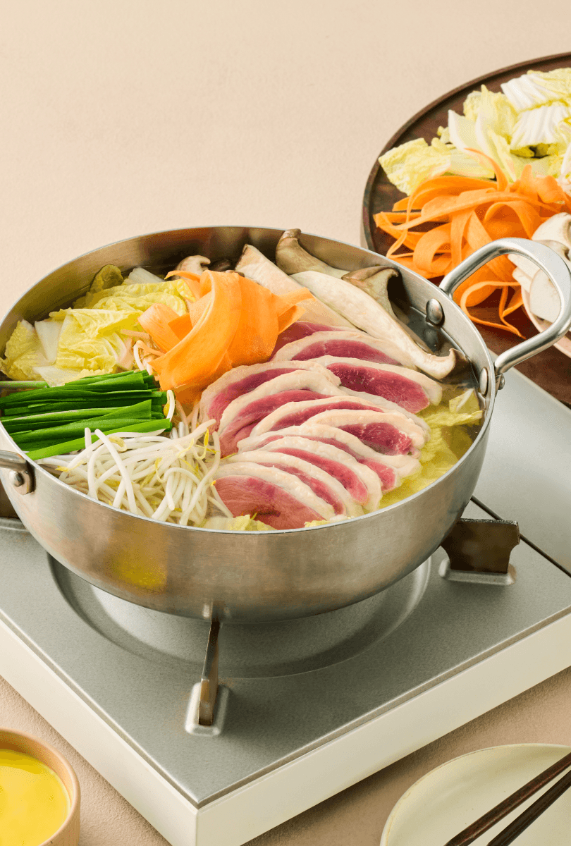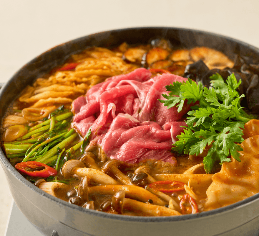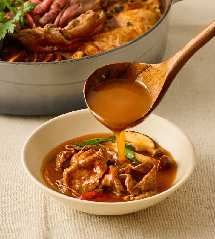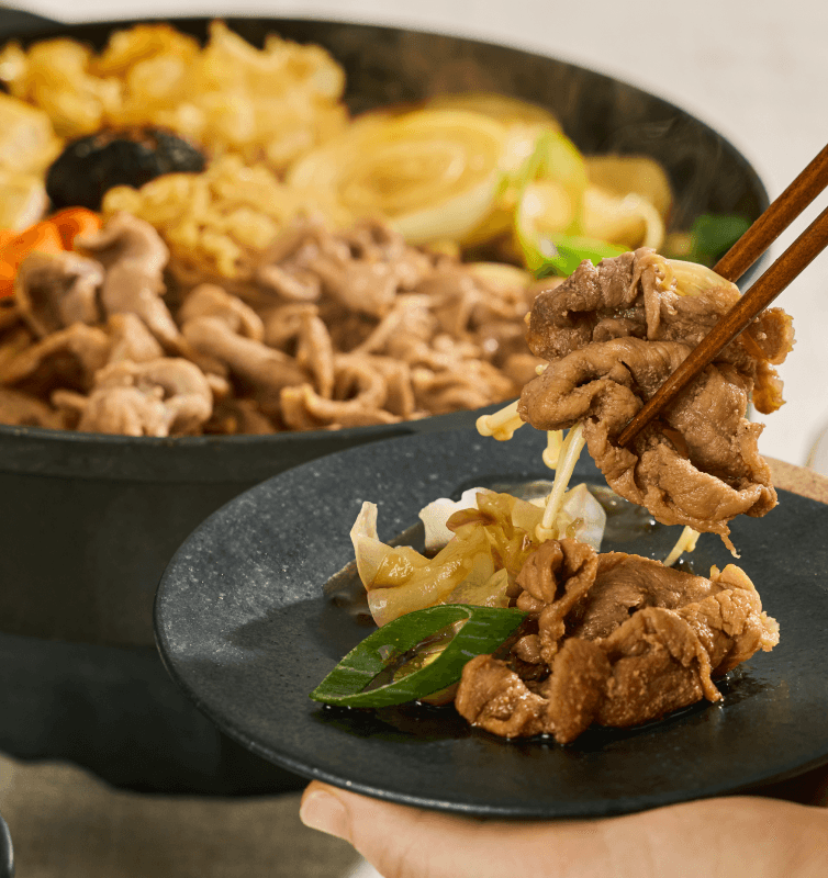 도축 후 숙성 +5일, 돼지고기의 육즙이 가득 차오른 순간. 얇게 썰어 부드러운 육질에 양념이 결마다 깊게 배어들어요. 부드러운 뒷다리살과 은은한 단맛이 어우러진 따뜻한 전골을 즐겨보세요.