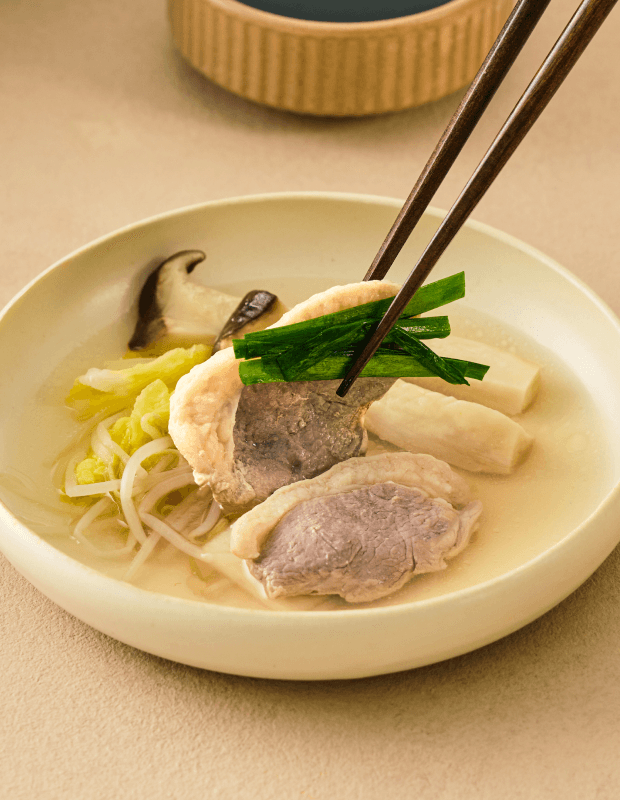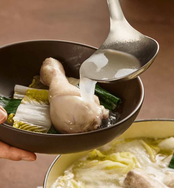 오늘 도계한 가장 신선한 순간의 닭고기. 오래 끓여도 푸석하지 않고 속까지 촉촉해 감칠맛을 더해요. 맑은 국물의 담백함에 국수를 더해 특별하게 즐겨보세요.